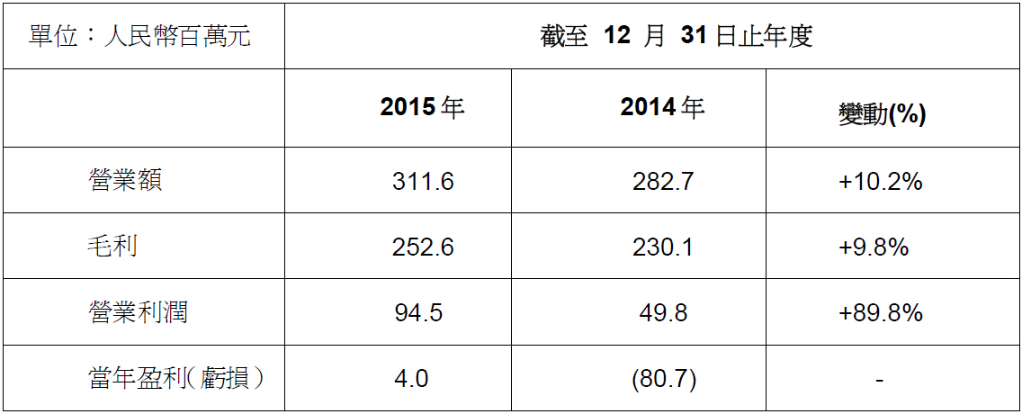 於報告期內,本集團業績錄得穩定增長,營業額同比增長10.2%至人民幣311.6百萬元 (2014年同期:人民幣282.7百萬元);營業利潤同比增長89.8%至人民幣94.5百萬元 (2014年同期:人民幣49.8百萬元);當年盈利達人民幣4.0百萬元,扣除上市及期權費用,美敦力諮詢費,可轉換債券影響,一次性損益等後為94.4百萬元,與去年同期67.1百萬元相比上升40.7%。