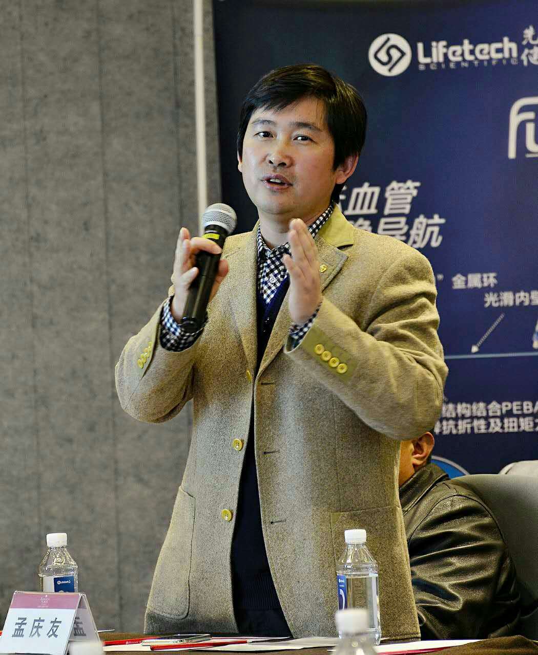 孟庆友教授向参会的专家们分享了采用体外开窗技术进行主动脉腔内治疗的经验。对于复杂胸腹主动脉瘤患者,可根据病人情况采用开窗技术保留分支血管。开窗技术既隔绝了动脉瘤,又保留了分支动脉的供血,为不能采用传统腔内移植物治疗的患者带来了希望。