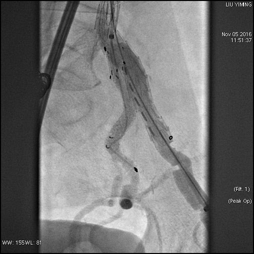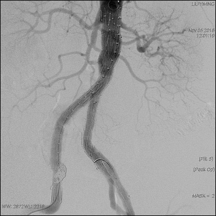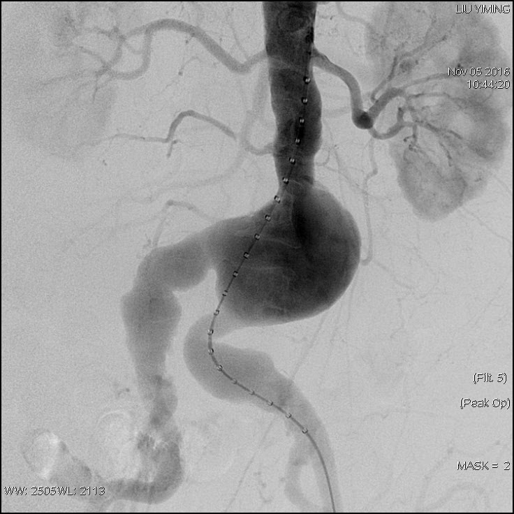 其中,在复杂主动脉病变腔内修复术应用手术直播中,郭伟教授带领其团队使用彩神在线网信彩票-彩神通免费版下载-彩神8争霸vlll-彩神购彩购彩大厅-彩神软件陆立根免费版-彩神ll争霸3-彩神ll彩神8-彩神ll争霸彩票-拼搏在线彩神网网页版科技公司的髂动脉分叉支架系统(IBD)以完全腔内重建的方式成功修复复杂腹主动脉瘤及髂动脉瘤。该例手术患者为64岁的男性,被诊断为肾下腹主动脉瘤,瘤体最大直径约6.5cm,双侧髂动脉瘤。患者成功植入彩神在线网信彩票-彩神通免费版下载-彩神8争霸vlll-彩神购彩购彩大厅-彩神软件陆立根免费版-彩神ll争霸3-彩神ll彩神8-彩神ll争霸彩票-拼搏在线彩神网网页版科技IBD支架,定位准确,无内漏,成功保留了左侧髂内动脉,术后造影显示髂内动脉通畅。