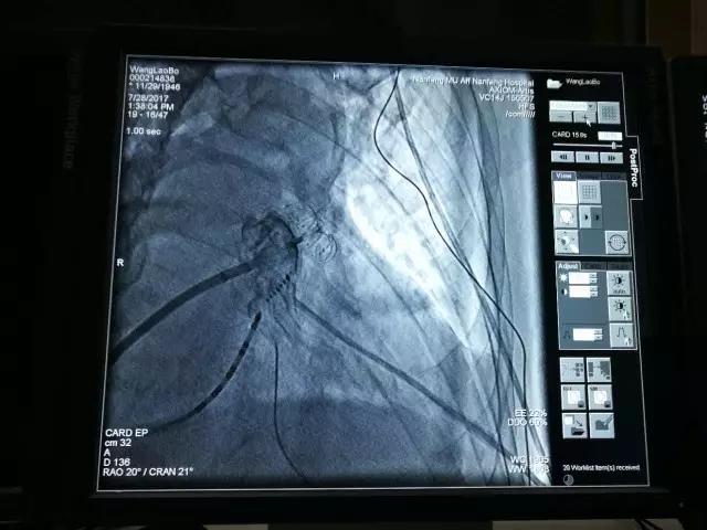 (左心耳封堵器释放后造影显示:封堵器封堵完全,无残余分流,对二尖瓣及左上肺静脉均无影响)