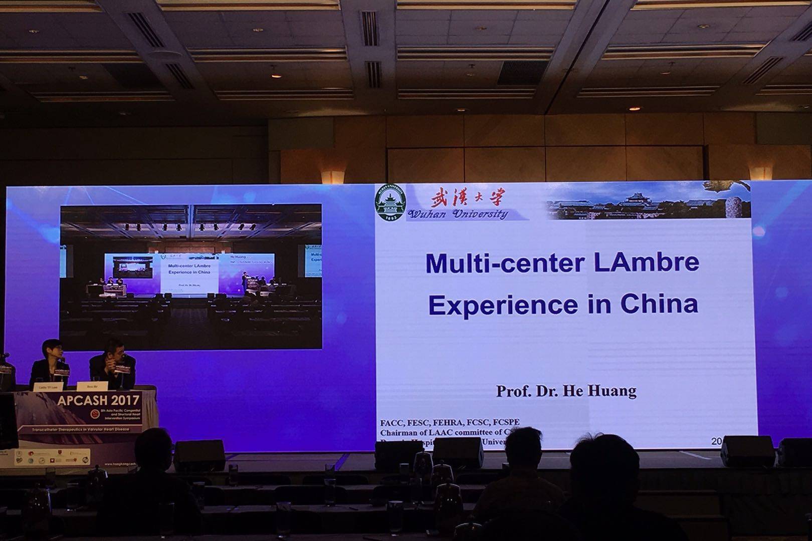 10月8日,来自武汉大学人民医院的黄鹤主任以”Multi-center LAmbre™ Experience in China” (LAmbre™左心耳封堵器系统中国多中心植入经验)为主题的演讲中与大家分享了自2017年6月LAmbre™左心耳封堵器系统在中国获批上市以来,中国大陆地区多个心血管中心使用LAmbre™左心耳封堵器系统进行手术植入的经验。黄鹤主任在其演讲中高度肯定了LAmbre™左心耳封堵器系统在产品设计和手术操作过程中独一无二的优势,并特别强调,LAmbre™在中国多中心的临床使用经验表明,其不仅可以适用于各种形态和尺寸的左心耳结构,且截至目前无任何器械脱落事件发生,是广大患者安全有效的治疗选择。