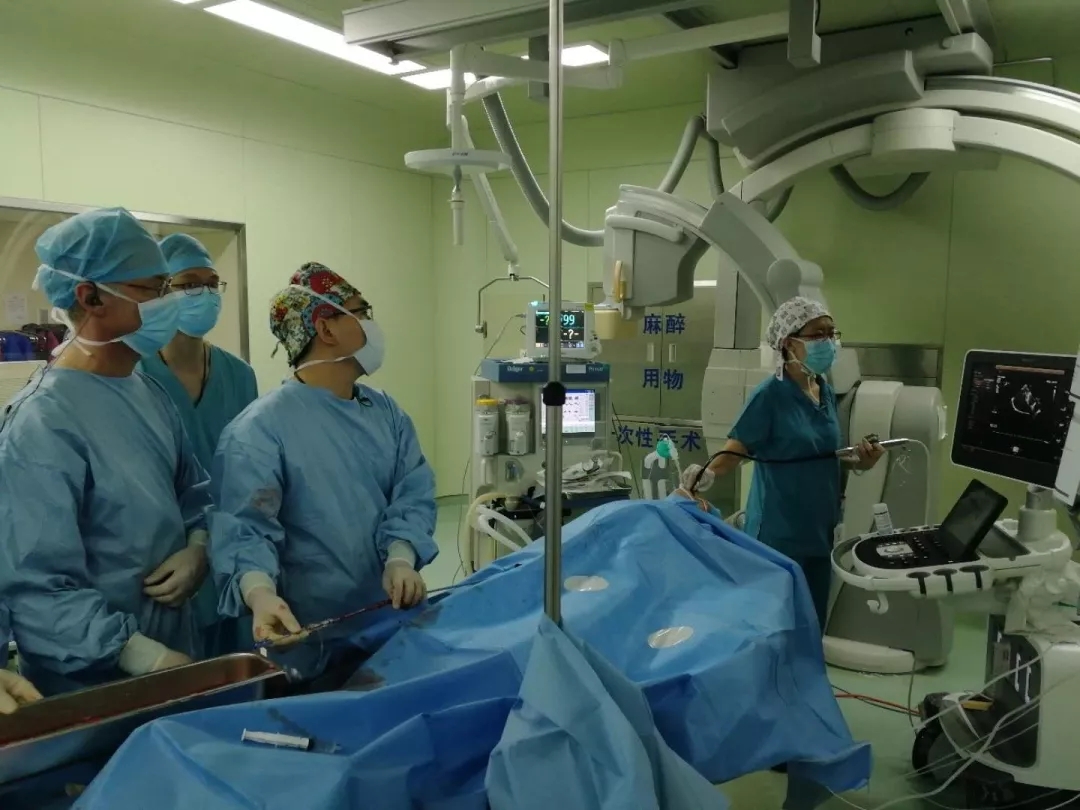 第二台手术为超声引导下经皮球囊二尖瓣成形术,接受手术的患者为一名45岁女性,诊断为二尖瓣狭窄同时伴有房颤,心功能III级(NYHA分级),Wilkins评分为6分。手术全程在超声引导下完成。相对放射线,超声引导下更容易定位房间隔穿刺点,可以根据心房的大小来调整穿刺点与二尖瓣的距离;其次,超声引导下更容易通过狭窄的二尖瓣瓣口。球囊和心脏结构的相对位置在超声下更直观可见,这样术中更方便调整球囊导管的方向;再次,超声引导下可以清晰显示球囊扩张的全过程以及实时判断球囊的位置是否正确;最后,扩张后超声可以对扩张效果、瓣膜反流以及是否合存在心包积液、腱索损伤等情况进行实时评估。手术过程顺利,术后效果良好,得到了与会专家的一致好评。