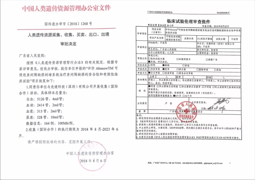 (图:科技部人类遗传资源管理部门审查批件和广东省人民医院伦理批件)