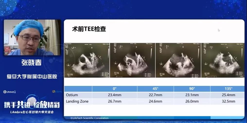 病例讨论环节中,复旦大学附属中山医院张晓春教授向与会专家们分享了一个在其中心进行的应用病例。该名患者左心耳内有异常发达的梳状肌,而且收缩幅度大。针对此情况,张教授折中选择固定盘尺寸,并指出固定盘要放置的足够深,才能使封堵盘与心耳口贴合得更紧密。对于该挑战性病例,张教授使用LAmbre™实现成功封堵,使患者得到了有效救治。