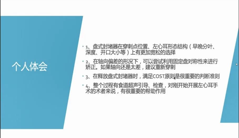 遂宁市中心医院谭震教授与大家分享了一个使用LAmbre™“小伞大盘”型左心耳封堵器封堵浅心耳的病例,并表示像LAmbre™这种盘式封堵器对于浅心耳结构患者是一个更好的选择。此外,谭震教授进一步分享了术中同轴性调整以及根据心耳特征选择对应封堵策略和封堵器型号的心得体会。