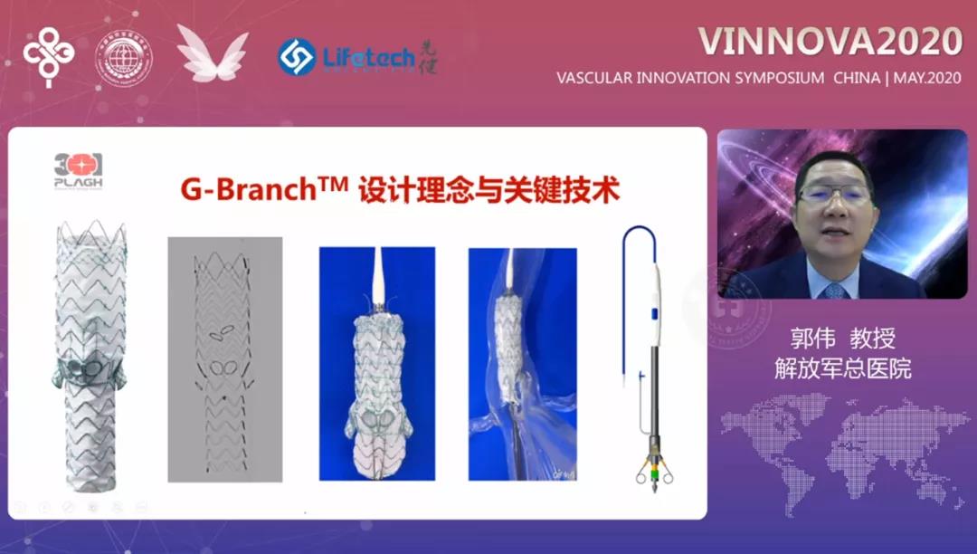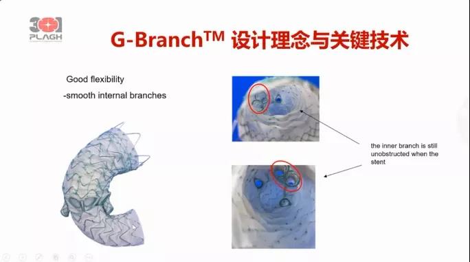 随后,解放军总医院第一医学中心郭伟教授以《开启重建内脏分支新时代:详解G-Branch胸腹主动脉覆膜支架系统设计理念》为主题进行了分享。郭伟教授重点对G-Branch™胸腹主动脉覆膜支架系统的设计理念与关键技术进行了深入解读,并详细讲述了该支架每一个部分的设计特点和临床优势:支架近端小波圈高低波设计,不仅增强了贴壁性,且有效防止内漏;支架主体倒刺设计,提供足够锚定力的同时防止滑脱和移位;内嵌分支为斜口设计,使得分支血管的角度适应性更强;半释放设计,可在释放后调整位置,精确定位;支架柔顺性好,在弯曲血管中能保持分支通畅;分支支架具有良好的弯曲性和抗挤压性等。郭伟教授总结并强调,G-Branch™胸腹主动脉覆膜支架系统具有适应症广,定位准确,操作简便安全等多重优势,是一款优秀的胸腹主动脉瘤腔内解决方案。