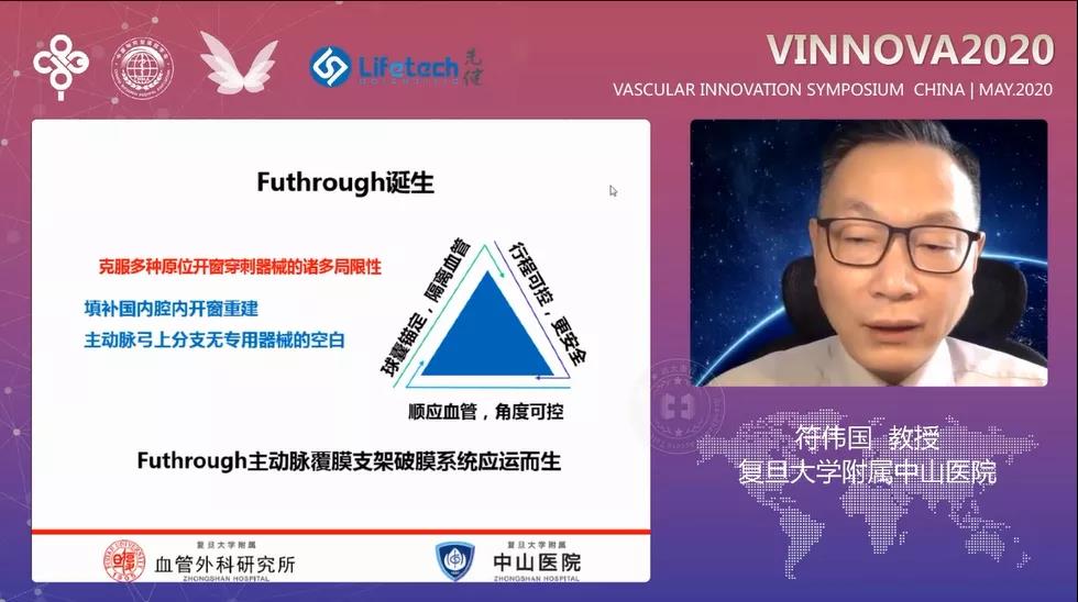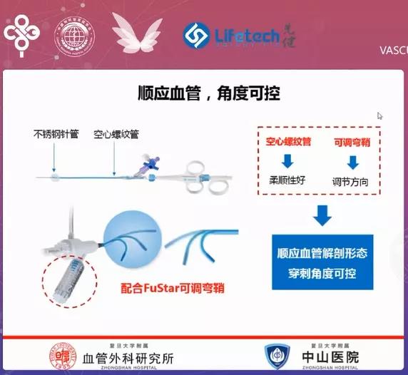 复旦大学附属中山医院符伟国教授以《独具匠心,随心所至:Fustar可调弯鞘和Futhrough主动脉覆膜支架破膜系统创新之路及临床应用体会》为题进行在线分享。符伟国教授介绍道:原位开窗重建分支血管更贴合正常的血管解剖结构,但目前市场上用于原位开窗的器械存在柔韧性差、头端不可调、穿刺长度不可控等局限性。为了克服这些问题,同时填补国内腔内开窗重建主动脉弓上分支无专用器械的空白,Futhrough™主动脉覆膜支架破膜系统应运而生。该产品可以顺应弯曲的主动脉弓分支血管,具有易操作性、较强的穿刺有效性、优秀的解剖适应性和相对更广泛的适应症等特点。临床应用结果显示,Futhrough™在左锁骨下动脉(LSA)解剖形态复杂(如开口在侧壁,与主动脉弓成角小等)的病例中均有良好的使用效果。Futhrough™主动脉覆膜支架破膜系统配合Fustar™可调弯鞘在原位开窗技术中进行应用,为主动脉弓部腔内病变的患者带来了更安全、有效的腔内介入解决方案。