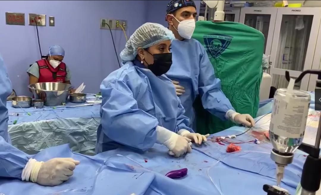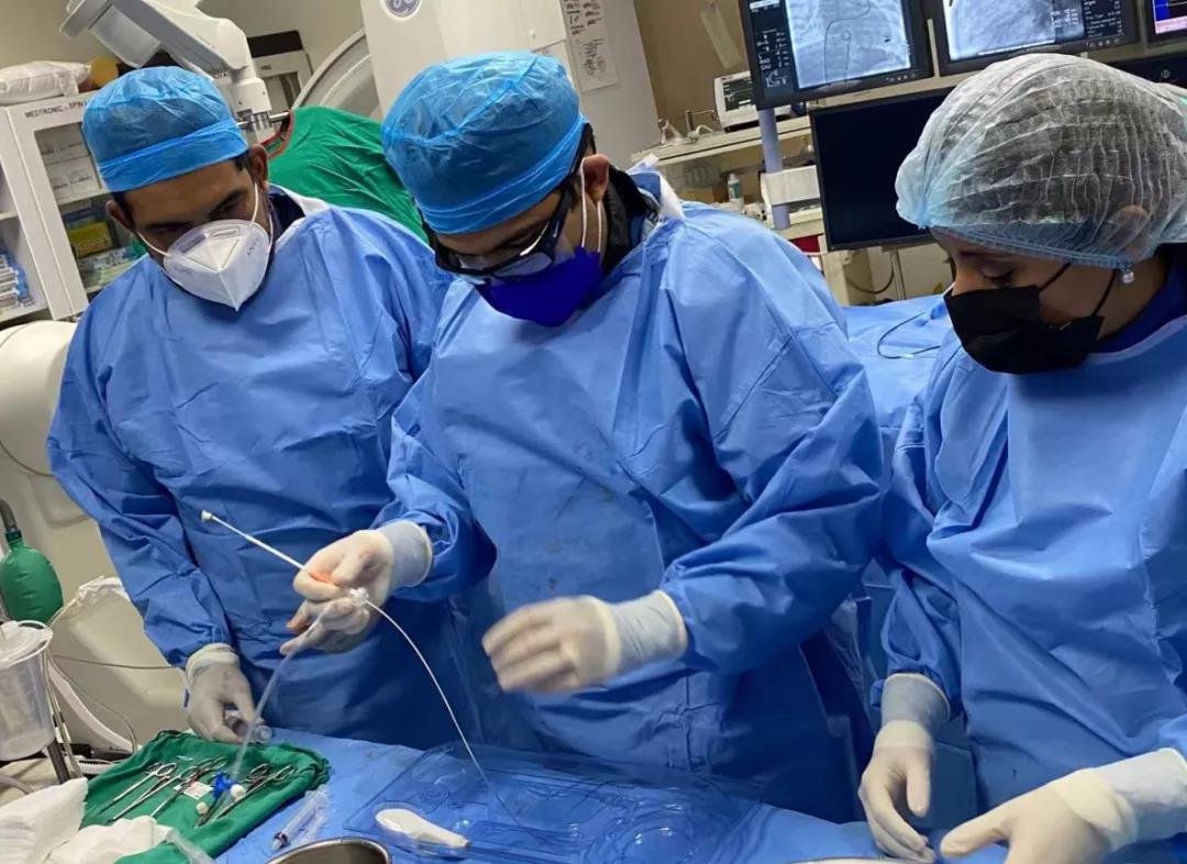 (图2:Prof. Juan Pablo Sandoval和Dr. Luis Morales为患儿进行PDA封堵术)