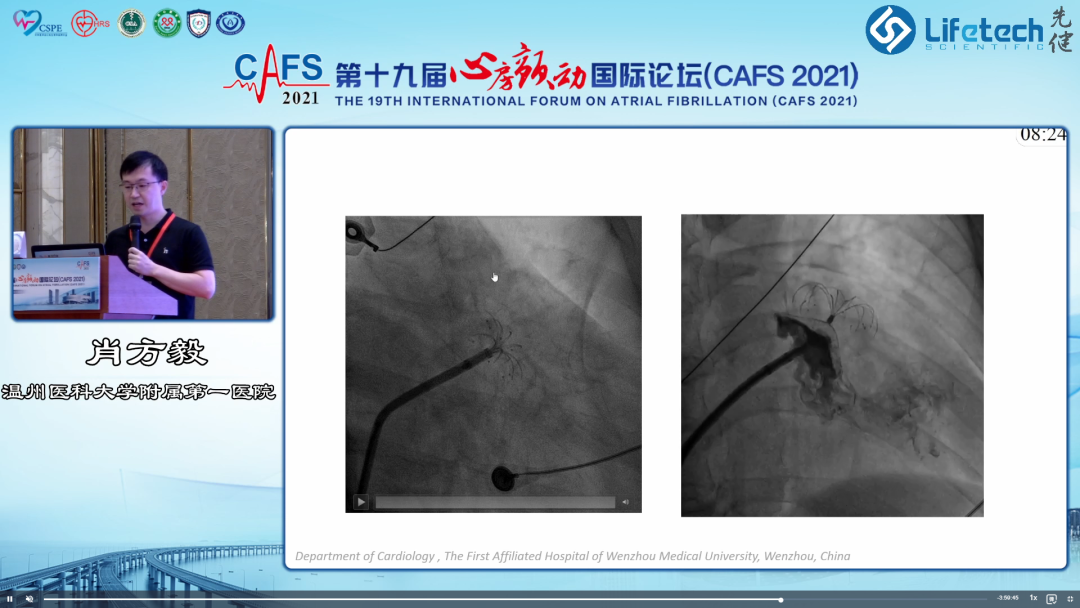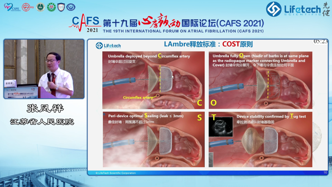 紧接着,温州医科大学附属第一医院肖方毅教授分享了LAmbre™渐进式植入法的技巧与单中心临床数据。肖教授表示,采用“渐进式”植入法在大多数情况下可以提高LAmbre™固定盘的完全打开率,降低术中的回收和调整次数,封堵器U型钩能够更加安全、有效地嵌入心耳,符合高质量的COST释放原则,避免迟发性心包积液的发生。