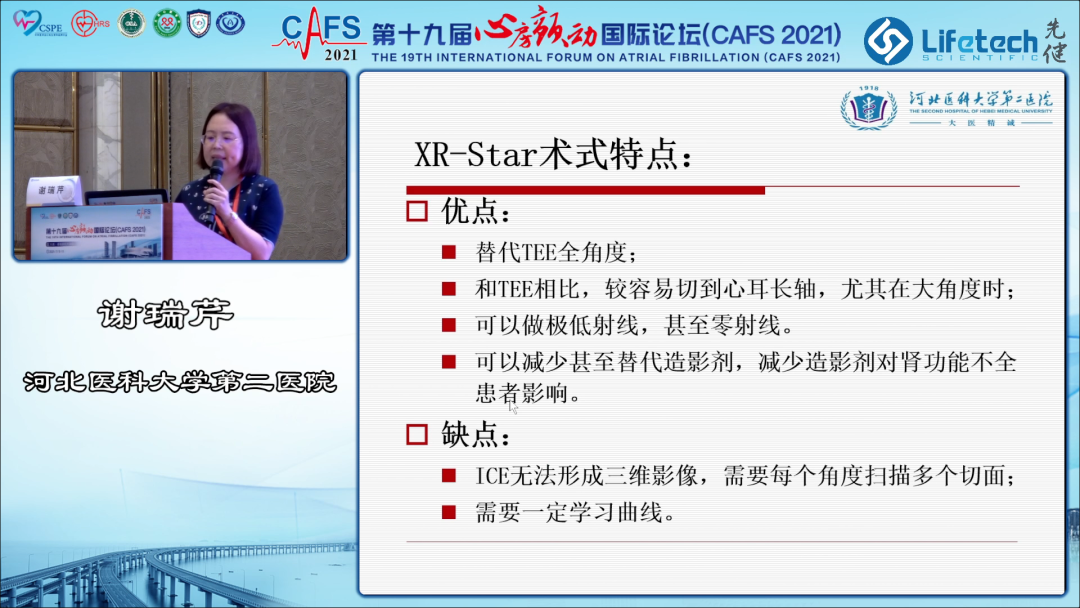 河北医科大学第二医院谢瑞芹教授在分享中指出,房颤导管消融联合左心耳封堵术能帮助患者在改善心衰的同时预防栓塞,是房颤综合诊疗的重要方法。谢教授独创的XR-Star术式对常规房颤一站式手术中存在的弊端进行了改良优化,将ICE引导替代TEE引导形成了一种新术式,不仅可以减少术中X线使用时间,且能够获得更加清晰的影像,三个月随访结果显示XR-Star术式的手术效果不劣于甚至优于术中应用TEE的效果。