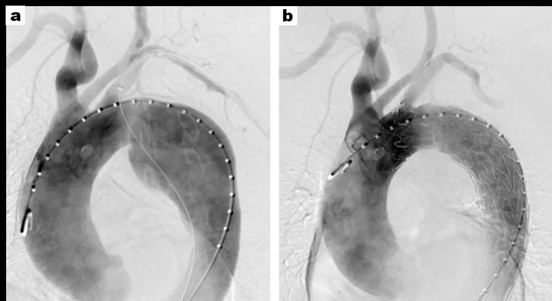 传统开放手术需要开胸和体外循环,带来极大的手术创伤。腔内治疗利用植入覆膜支架可实现不开胸,不阻断血流的微创修复。但主动脉弓部的腔内治疗既要隔绝病变又要同时保持弓上分支血管通畅,其手术难度远高于其它位置。