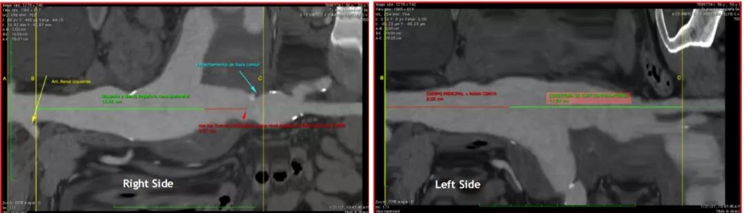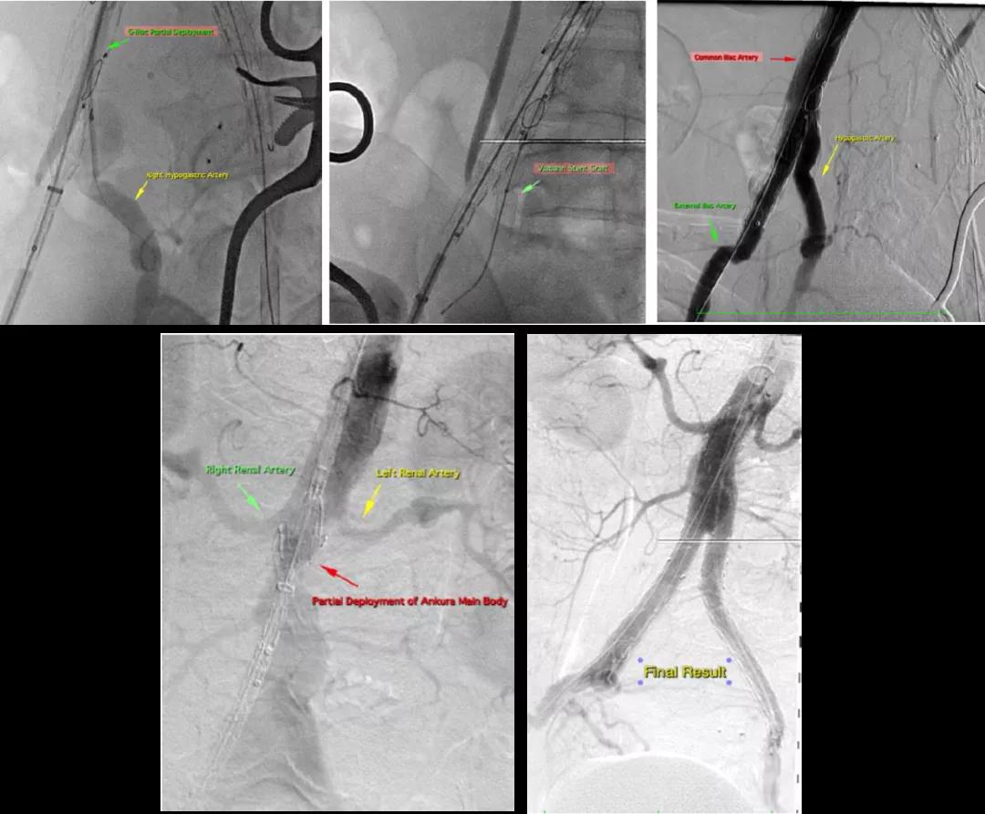 手术在委内瑞拉Ascardio医院顺利进行,Prof. Jesús Garcia首先从左侧入路,通过Fustar™可调弯鞘将Cera™血管塞输送到患者左侧髂内动脉,对左侧髂内动脉进行栓塞,然后再从右侧入路,植入Ankura™腹主动脉覆膜支架隔绝腹主动脉瘤,随后送入G-iliac™髂动脉分叉支架系统完成重建患者右侧髂内动脉。每一个环节都有条不紊的进行,术后造影显示支架位置形态良好,瘤体隔绝完全,支架内血流通畅,且无内漏及任何并发症发生,患者在术后3天便顺利出院。