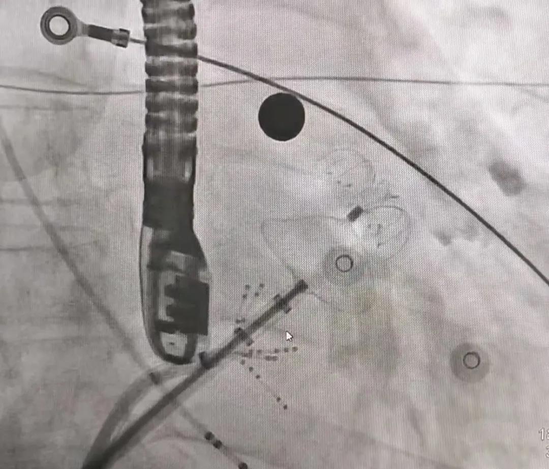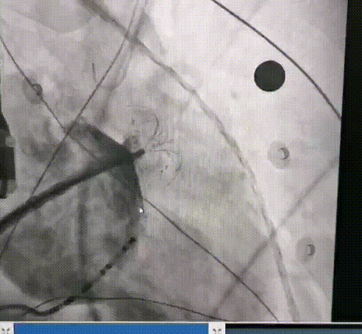 患者男,63岁,间断心悸病史11年。术前TEE显示左心耳无血栓,拟行房颤射频消融联合左心耳封堵术。左心耳测量锚定区约为27mm,封堵区约为25mm,选用LAmbre™2632封堵器进行封堵,达到了理想的封堵效果。LAmbre™独特的锚定机制能确保左心耳封堵器稳定牢固,牵拉测试十分稳定,符合COST原则,随后释放封堵器。