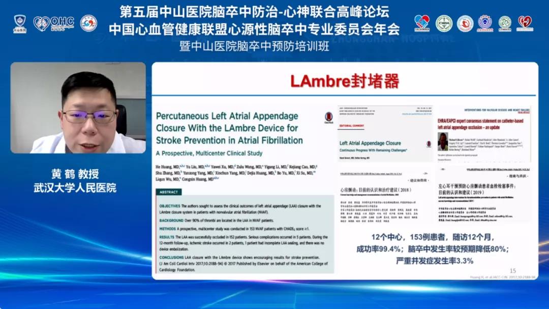 武汉大学人民医院黄鹤教授首先回顾了左心耳封堵术在中国的发展历程,并结合相关循证医学证据与植入数据,对左心耳封堵术在中国的发展现状进行了详细论述。目前,左心耳封堵术已获得业内广泛的认可与应用,具有很好的临床应用前景。黄鹤教授特别强调,在左心耳封堵术发展的道路上,涌现出许多优秀的封堵器械,其中,LAmbre™作为我国首款自主研发的左心耳封堵器,为房颤患者预防卒中提供了安全有效的解决方案,充分展示了国产原研器械的创新实力。最后,黄鹤教授总结道,未来,对于房颤卒中的综合管理,需要加强左心耳封堵术的规范化开展,持续关注与预防术后并发症的发生,深化研究,积累经验。