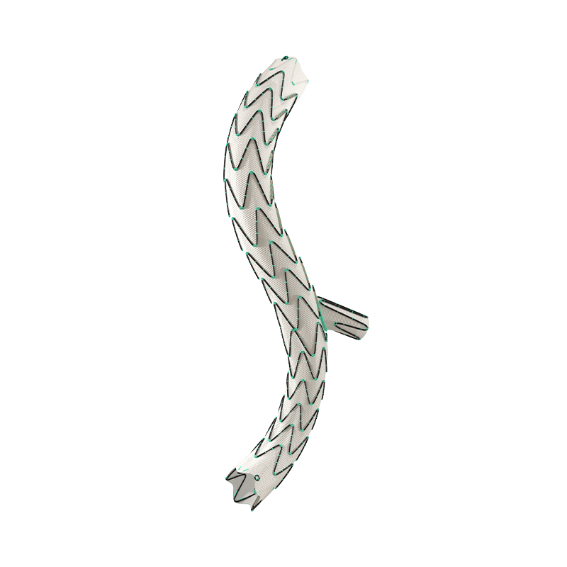 该产品由髂动脉分叉支架、髂内覆膜支架及其各自配套的输送器组成。髂动脉分叉支架由自膨式镍钛合金支架和PET膜组成;髂内覆膜支架由自膨式镍钛合金支架和e-PTFE膜组成。骼动脉分叉支架系统用于治疗腹髂动脉瘤或髂总动脉瘤。